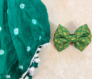 Holi Outfit for Dog and Mom: Matching Dog Bow Tie and Bandhani Dupatta (Green)